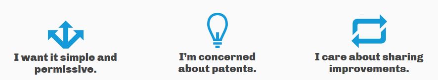 These capture three common, primary concerns that show up once one has made the decision to be open with one’s source code. Simple, permissive licenses include MIT’s (which GitHub links to) and the BSD license (which GitHub doesn’t note). Open licenses that address patents include Apache 2.0 (GitHubbed) and OSL 3.0 (not GitHubbed) and GPL 3.0 (GitHubbed in the next category). If one wants to ensure that improvements, if made public, are shared on common terms, then the GPL 3.0 is a good choice (though there are drawbacks as well).