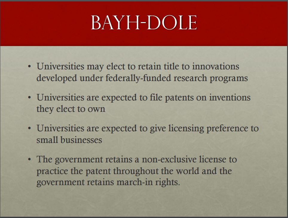 Oklahoma’s IP counsel also includes a slide on Bayh-Dole: